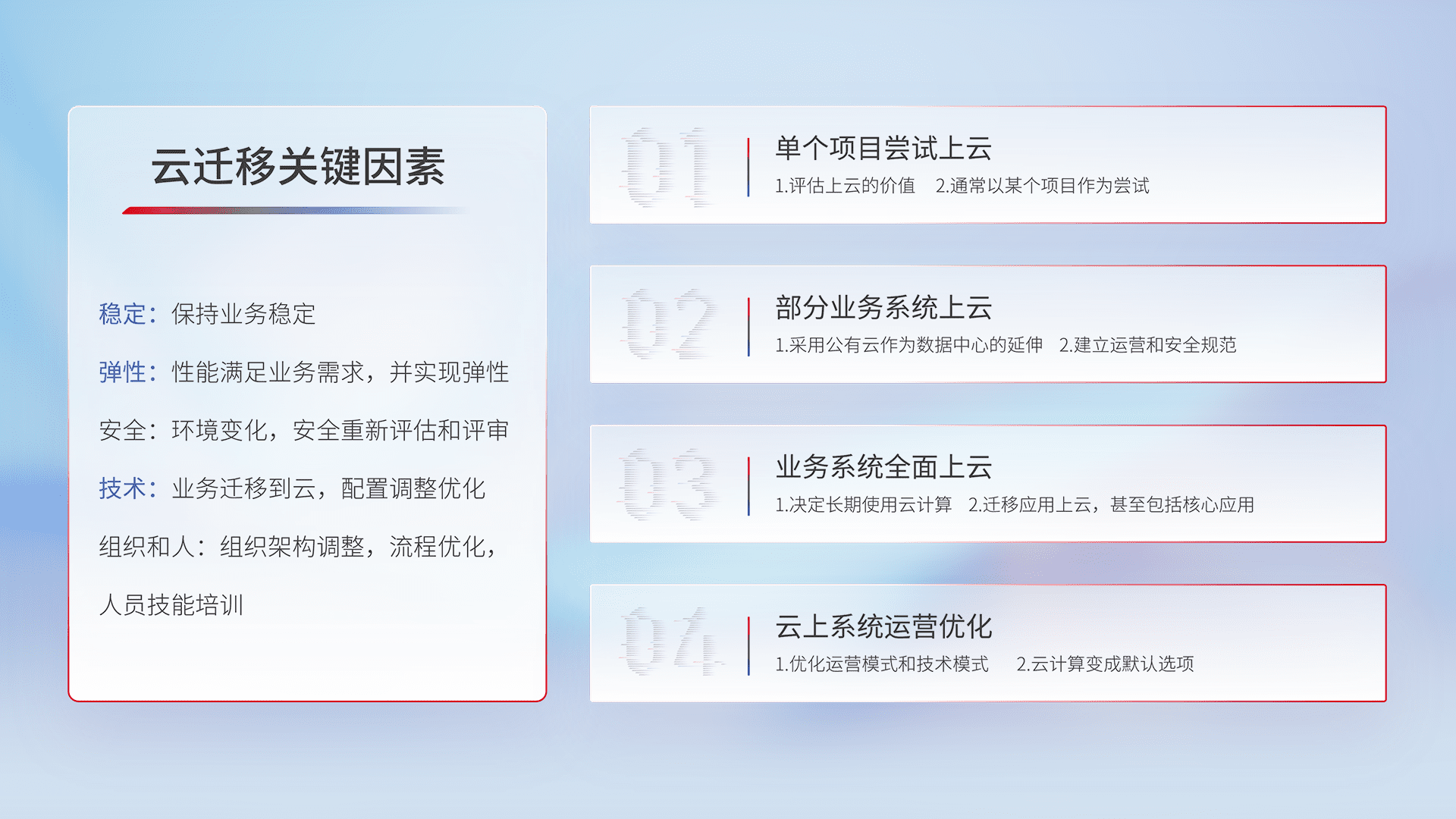 结合实际业务,,从规划设计、、云平台选型、、云原生改造、、、数据迁移、、、、集成交付,,,迁移全过程为客户识别最佳上云路径,,,,做好风险识别管理,,设计网络架构、、身份权限、、、安全审计合规、、、操作审计、、、、日志审计、、、、监控告警策略、、、、多站点容灾设计等,,对云上基础设施进行整体规划,,提升IT治理水平,,,,以满足弹性、、、高可用、、、高性能的需求。。