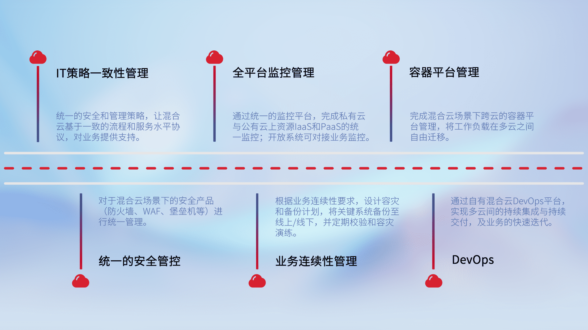 通过多云纳管,,以统一的资源数据模型把客户的云资源进行抽象和封装,,,进而实现对多云资源的统一操作,,,,保障云资源管理的可靠性、、稳定性与可用性。。量身定制化运维内容,,,配置、、开发运维、、、、补丁管理、、、、备份、、、监控、、、认证和访问管理、、、审计和日常巡检等,,,,保障在用云过程中的可靠度,,稳定度以及高可用率。。