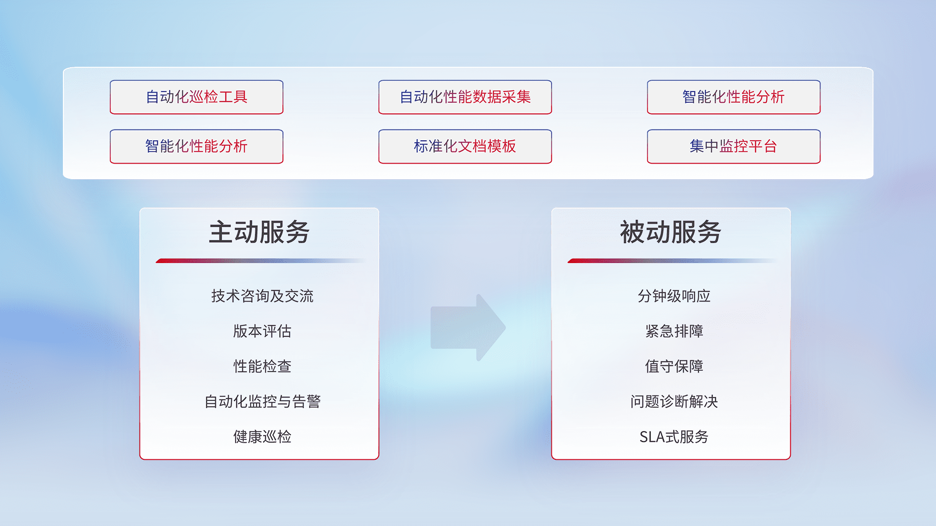 智能化工具和标准化文档,,,保障服务质量,,,,提供主动服务(包含技术咨询、、、、版本评估、、、性能检查、、自动化监控与告警、、、健康巡检)和被动服务包含(分钟级响应、、、、紧急排障、、值守保障、、、、问题诊断解决、、、、SLA服务)。。。。